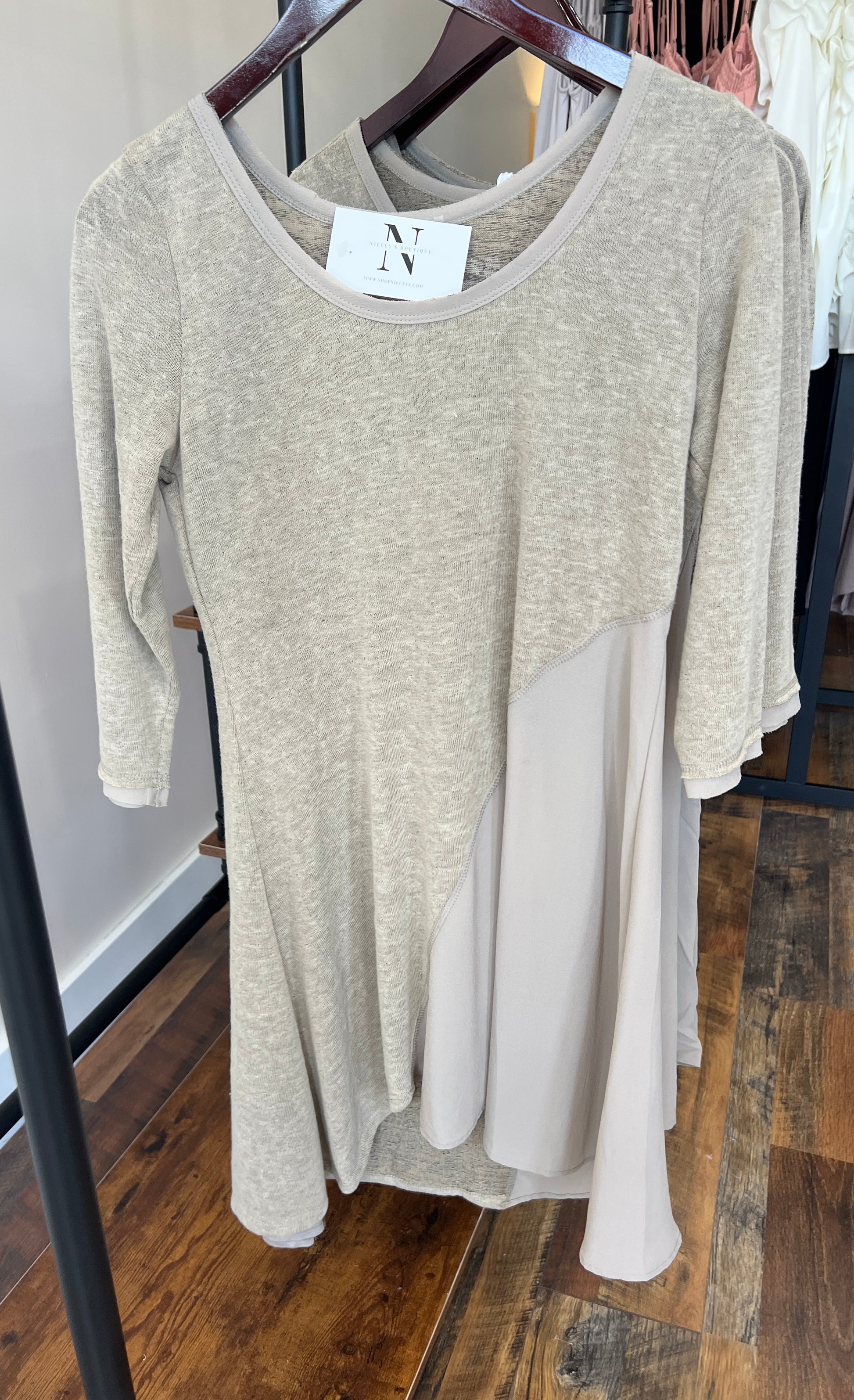 We are obsessed with this dress! It features the use of two materials and a high low hem. It is trimmed with raw edge silky material.