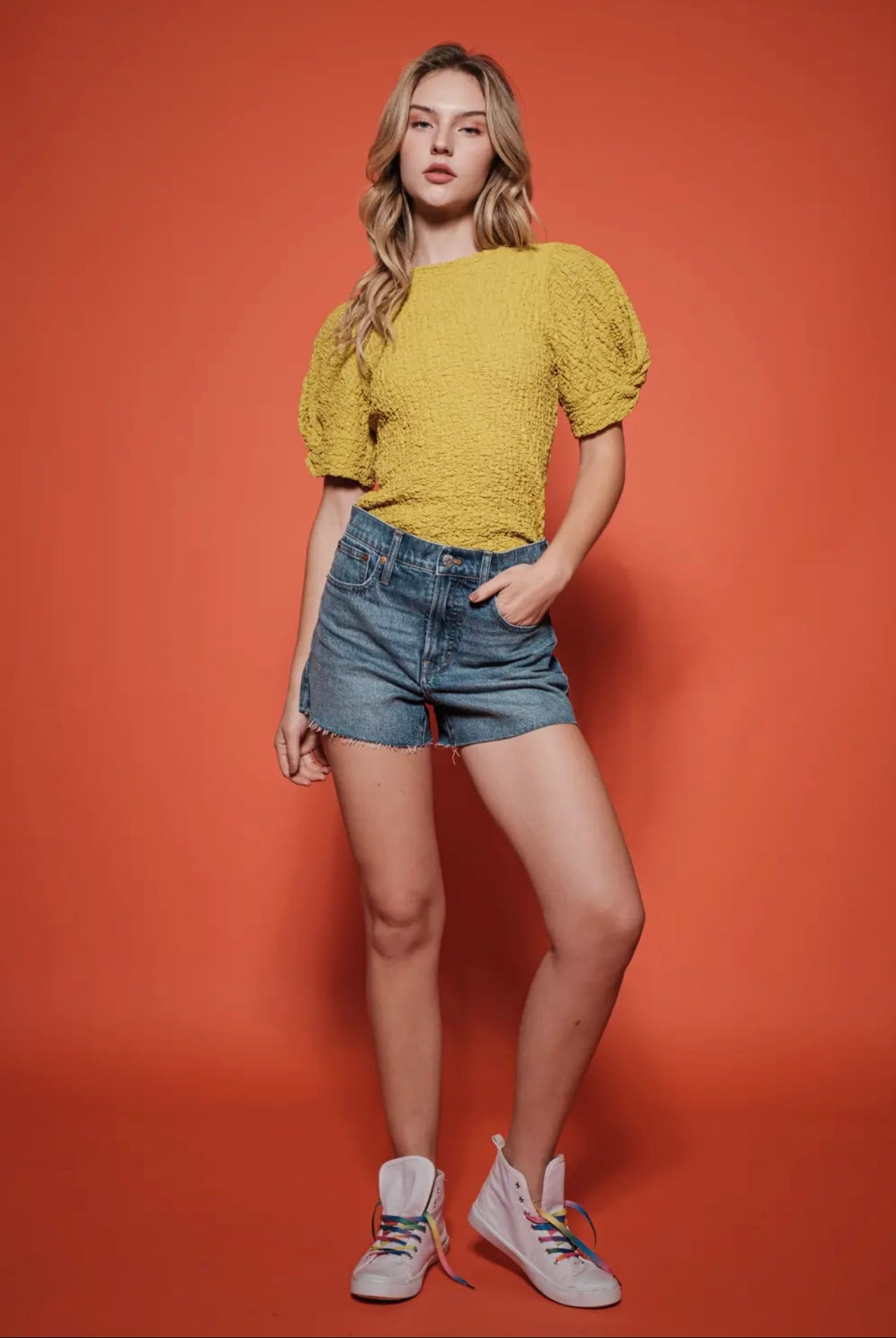 The Hallie Puff Top is expertly crafted with a textured fabric, creating a unique and eye-catching design. The puff short sleeves add a playful touch, while the shirring tuck sleeve detail adds dimension and interest. Elevate your wardrobe with this stylish and versatile top.