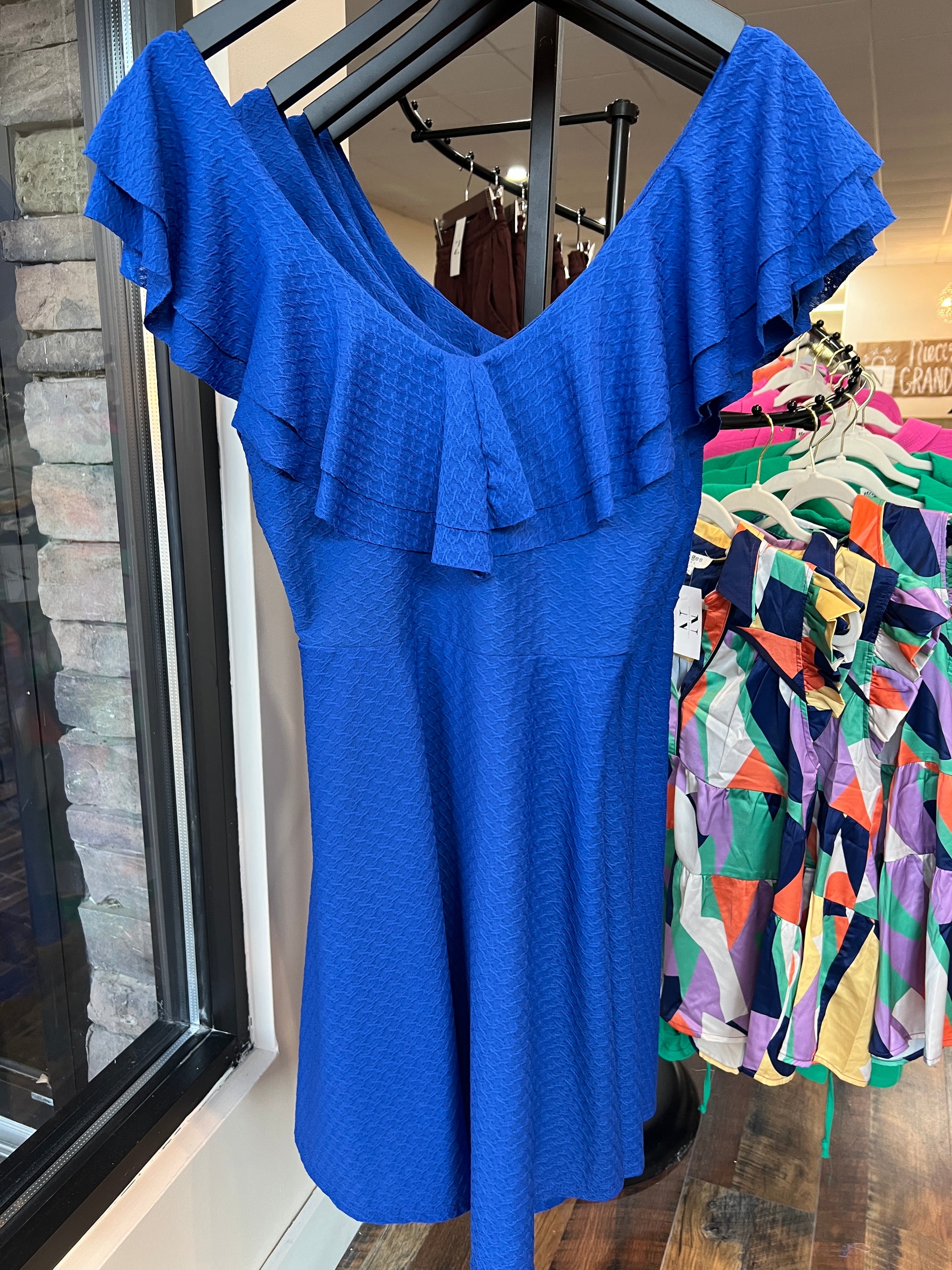 This stunning royal blue a-line dress is a dream!! It features a deep v cut neckline with double layered ruffles. The material is stretchy and has a cool textured design.